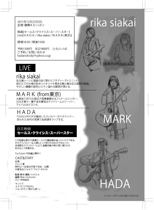 12/25、鶴舞のKDハポンで映画上映とLIVEの催しをします。LIVEは東京からMARKさんをお呼びし、名古屋からはrika siakaiという素晴らしいユニットに出て頂きます。自分も強力なサポート陣と望みます。よろしくお願いします!!